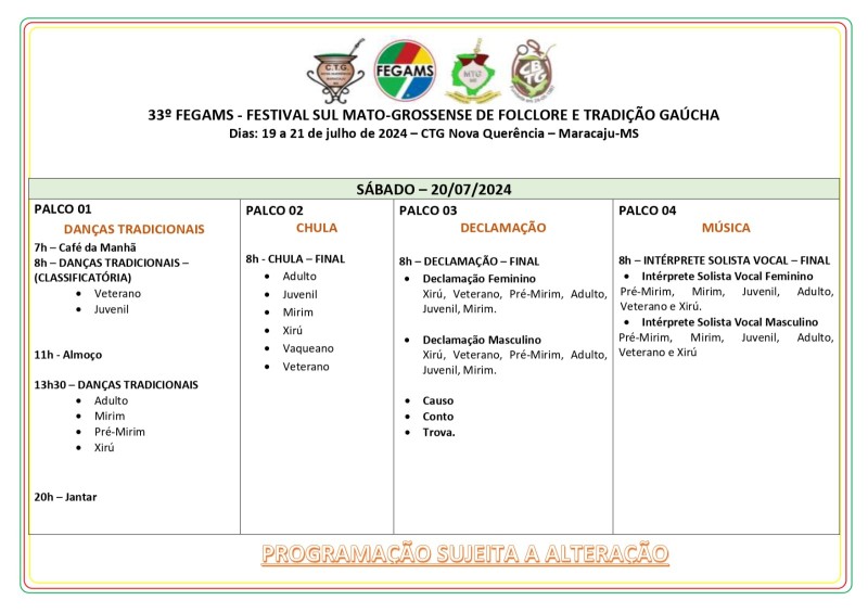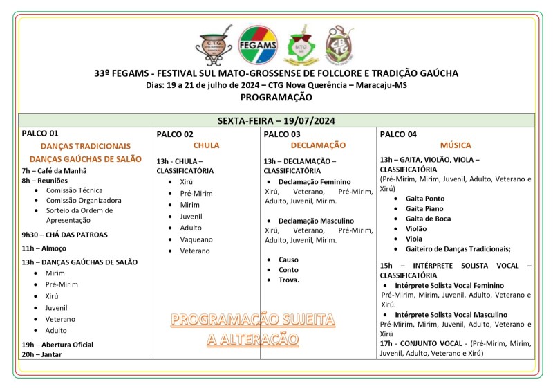 O MTG-MS divulga a programação do 33º Festival Sul-mato-grossense de Folclore e Tradição Gaúcha (Fegams), que acontecerá na cidade de Maracaju-MS (CTG Nova Querência), nos dias 19, 20 e 21 de julho de 2024. Está disponibilizado no site o Regulamento Geral do Fegams, acesse aqui.